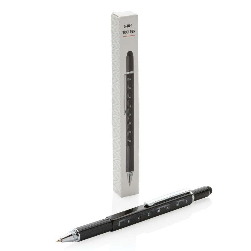 Multifunction pen with ruler (7cm) , spirit level, screw driver, stylus tip and ballpoint with blue writing ink (up to 400m) Made out of high quality brass material with aluminium clip.