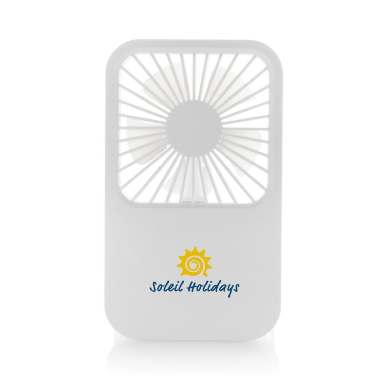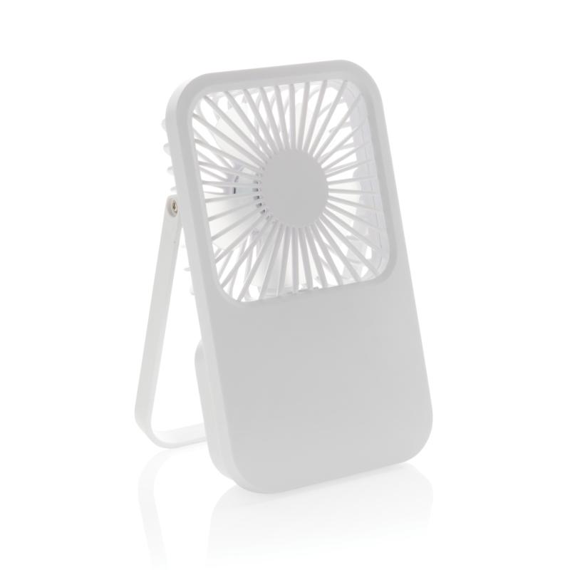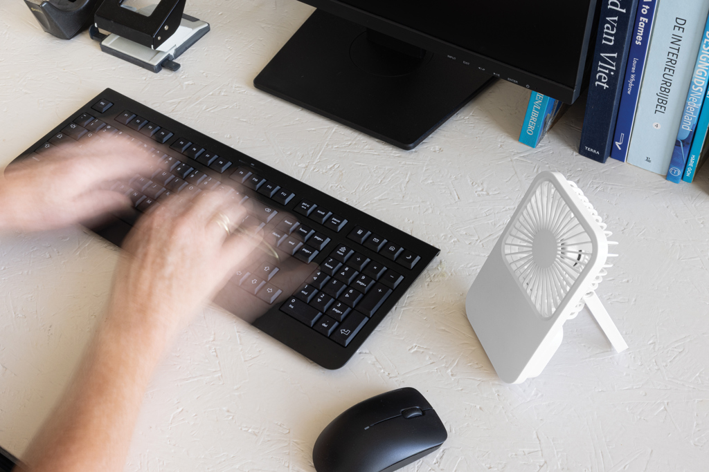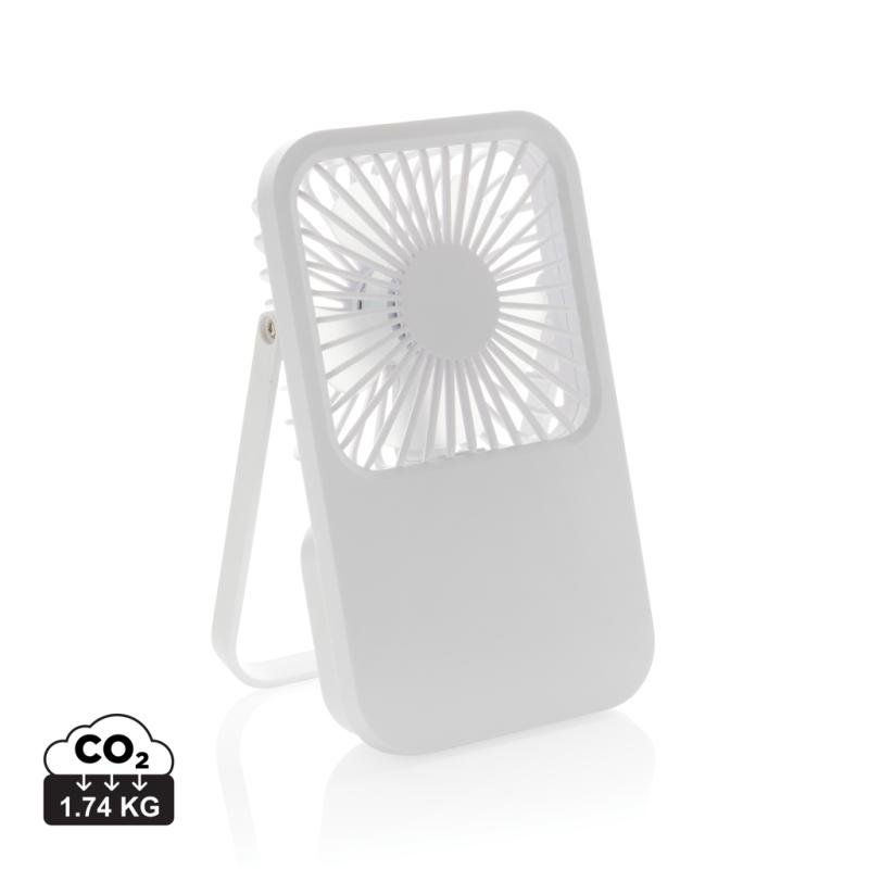 The Aervina desk fan, made from RCS certified recycled plastic, is a sleek and practical way to enjoy a refreshing breeze at home or in the office. Its modern black design combines style with function. The rechargeable 1200 mAh Li-ion battery provides up to 3 hours of working time and recharging in 4 hours via the included 120 cm black TPE USB-A to USB-C cable. With three adjustable speed levels and an adjustable stand, the Aervina fan offers flexible comfort wherever you need it. Made from RCS certified recycled ABS plastic. RCS (Recycled Claim Standard) is a standard to verify the recycled content of a product throughout the whole supply chain. Total recycled content: 58 % based on total item weight. This fan is PVC-free and packaged in an FSC® certified kraft box.Max. power: 5W | Input current: 5V / 400mA.