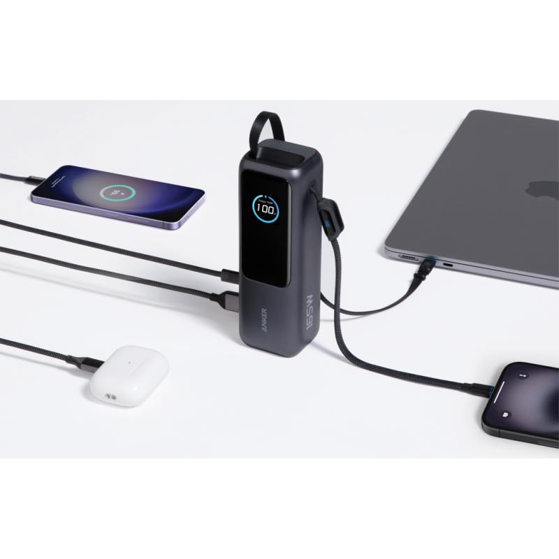 This Anker Powerbank (25.000 mah, 165W, Built-in and Retractable Cables) is built for serious on-the-go charging. With a massive 25,000 mAh capacity and up to 165 W output, it powers everything from smartphones to laptops with incredible speed—charging a MacBook or iPhone to 50% in under 35 minutes. Its standout feature is the two built-in USB-C cables: one retractable and one integrated into a durable carry strap, eliminating the need to pack extra cables. You can charge up to four devices simultaneously via additional USB-A and USB-C ports, all while staying informed with a smart digital display that shows real-time power and battery status. With Anker’s advanced ActiveShield 2.0 for safe charging and a compact, rugged design, this powerbank is ideal for work, travel, or daily use when performance and convenience matter most.