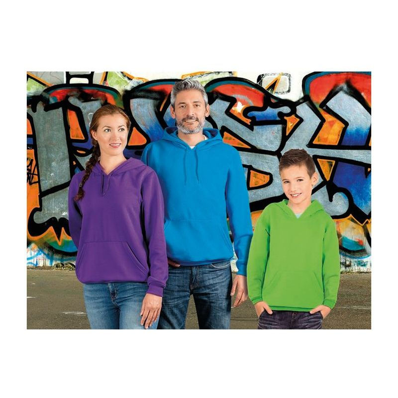 100% polyester 280 grs/m2 brushed fleece fabric inside. Double fabric hood. Adjustable drawstring on the hood (except children sizes). Kangaroo pocket. Ribbed cuffs and waist. 20 units per box. 1 unit per package: 1 size, 1 color.
