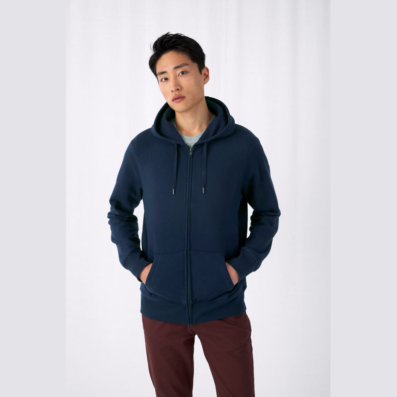 80% pre-shrunk ring-spun more sustainable Cotton men's sweatshirt, combed - 20 % Polyester. Straight cut, hood with single jersey lining, flat cords with metal tips, necktape, concealed metal zip, single jersey halfmoon on back. 280 g/m²