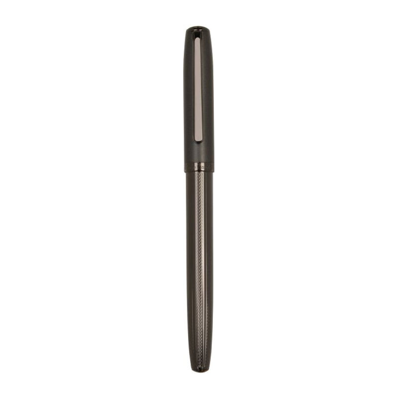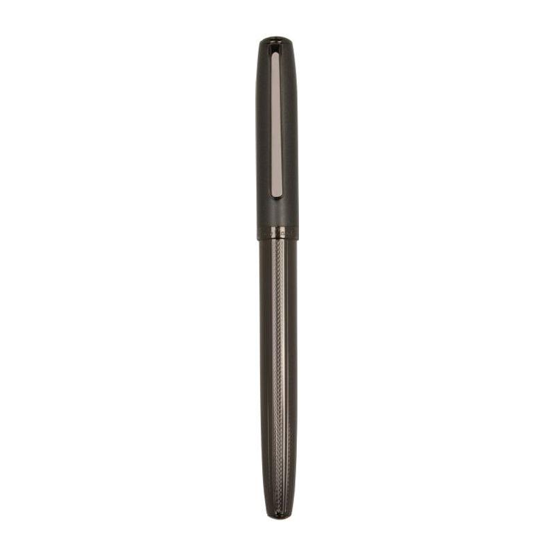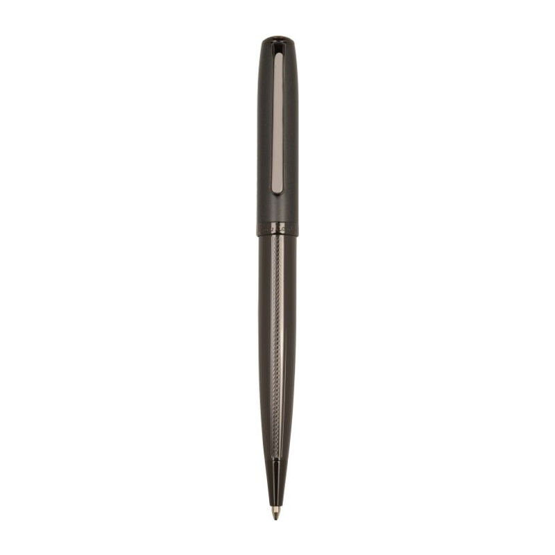 Pierre Cardin luxury metal roller and ballpoint pen. The pen bodies feature a structured gunmetal design and their upper parts are in dark grey. The tip of the roller is protected by a cap, the ballpoint pen has a rotating mechanism. Roller contains a German Schmidt cartridge in blue with a 0.6 mm tip, the ballpoint pen contains a quality refill in blue with a 1 mm tip. Both come with a spare black refill. Packed in a gift box with a certificate of authenticity.