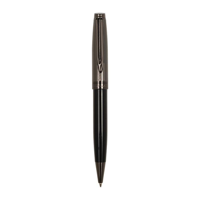 Pierre Cardin luxury ballpoint pen in an elegant design. The pen body is designed in glossy black with structured upper part in gunmetal. The ballpoint pen has a rotating mechanism and contains a quality refill in blue with a 1 mm tip. It comes with a spare black refill. Packed in a gift box with a certificate of authenticity.