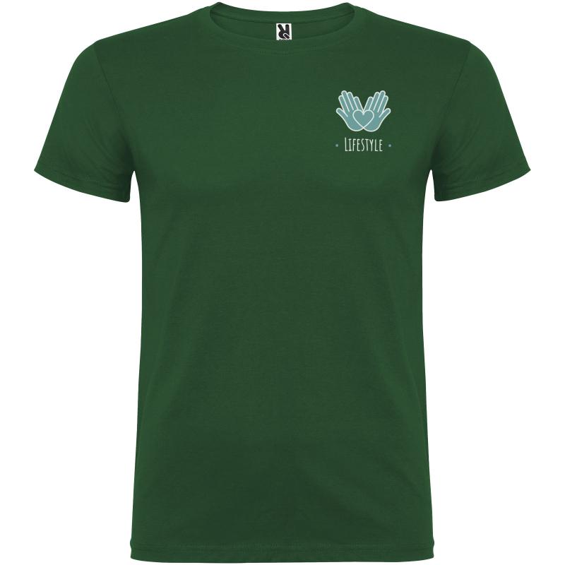 Short-sleeve t-shirt with double layer crew neck in elastane, made in tubular fabric for adults. Reinforced covered seams in collar. Removable label. The model is 190 cm and is wearing size L.