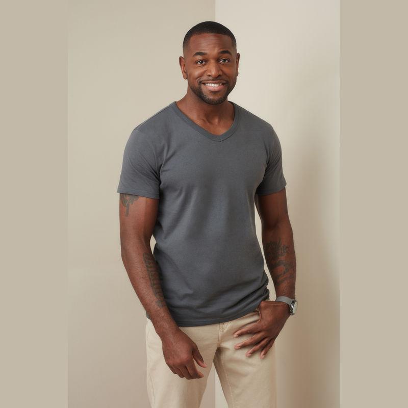 Classic cut V-neck T-shirt for men features collar with rib binding and made of durable single jersey cotton.