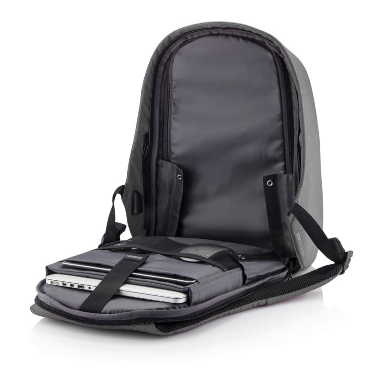 The Bobby Hero line represents a new era in anti-theft backpacks, offering safety, ease and organisation for your daily journeys. Cut-proof protection, discreet zipper closures and concealed pockets ensure the security of your belongings during commutes. The Bobby Hero XL is equipped with an integrated USB charging port, illuminating safety strips and a luggage strap for added convenience. Internally, padded compartments cater to a 17” laptop and a tablet up to 12.9”. Made from R-pet fabric with the AWARE™ tracer. With AWARE™, the use of genuine recycled fabric is guaranteed. 32% recycled content. Registered design®
