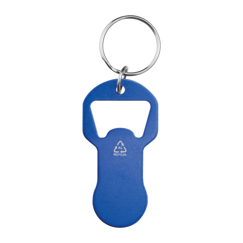Breloc din aluminiu reciclat, cu deschizător de sticle și fisă integrată pentru căruciorul de cumpărături. Ușor, practic, ideal pentru uz zilnic.