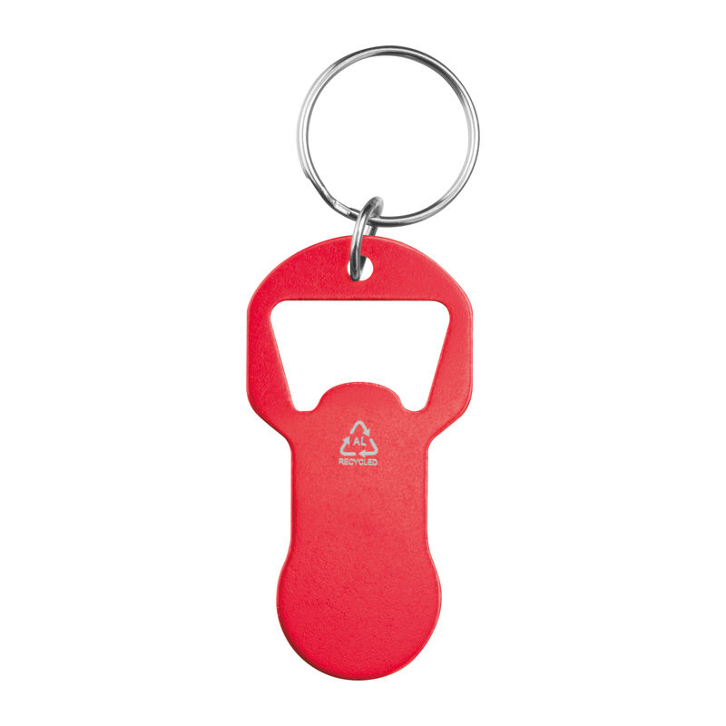 Breloc din aluminiu reciclat, cu deschizător de sticle și fisă integrată pentru căruciorul de cumpărături. Ușor, practic, ideal pentru uz zilnic.