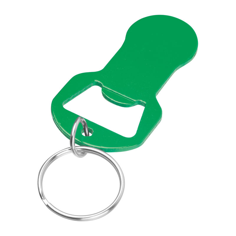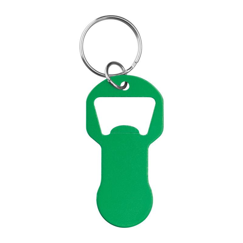 Breloc din aluminiu reciclat, cu deschizător de sticle și fisă integrată pentru căruciorul de cumpărături. Ușor, practic, ideal pentru uz zilnic.