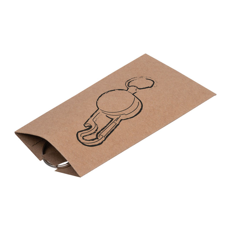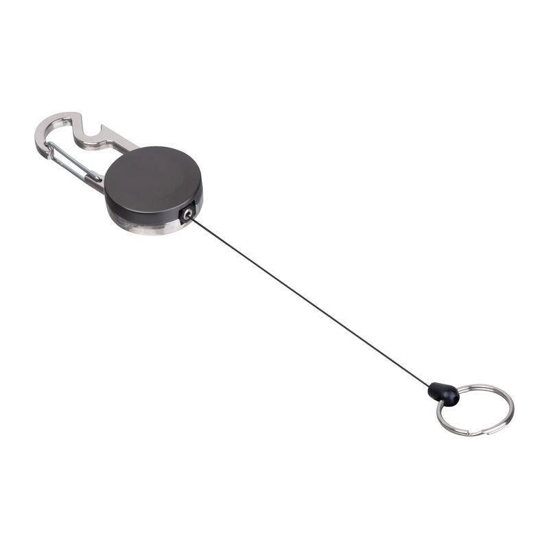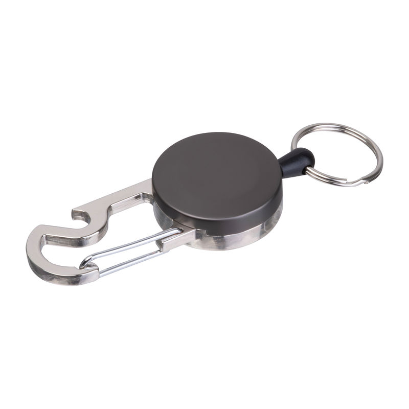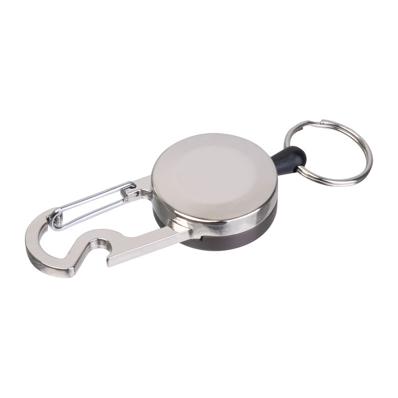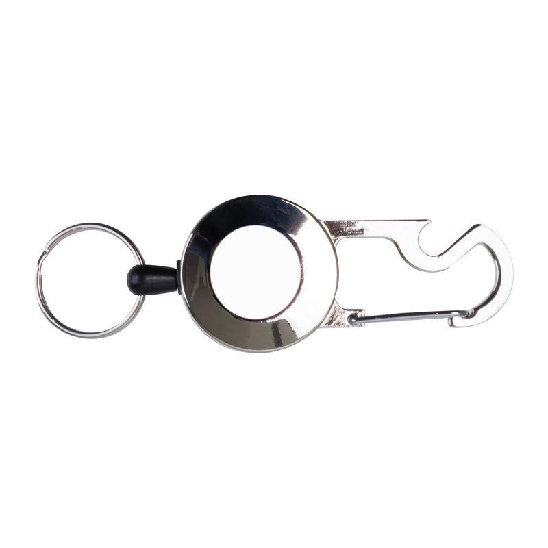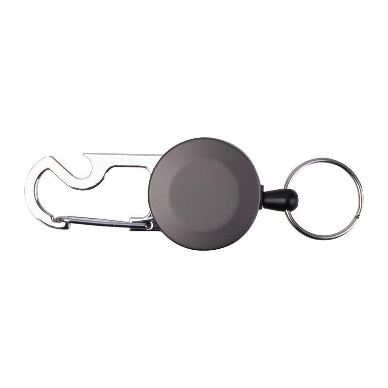 Breloc metalic retractabil, cu suport pentru card transparent și carabină metalică prevăzută cu un desfăcător de sticle. Inelul se extinde până la 55 cm, retractabil.