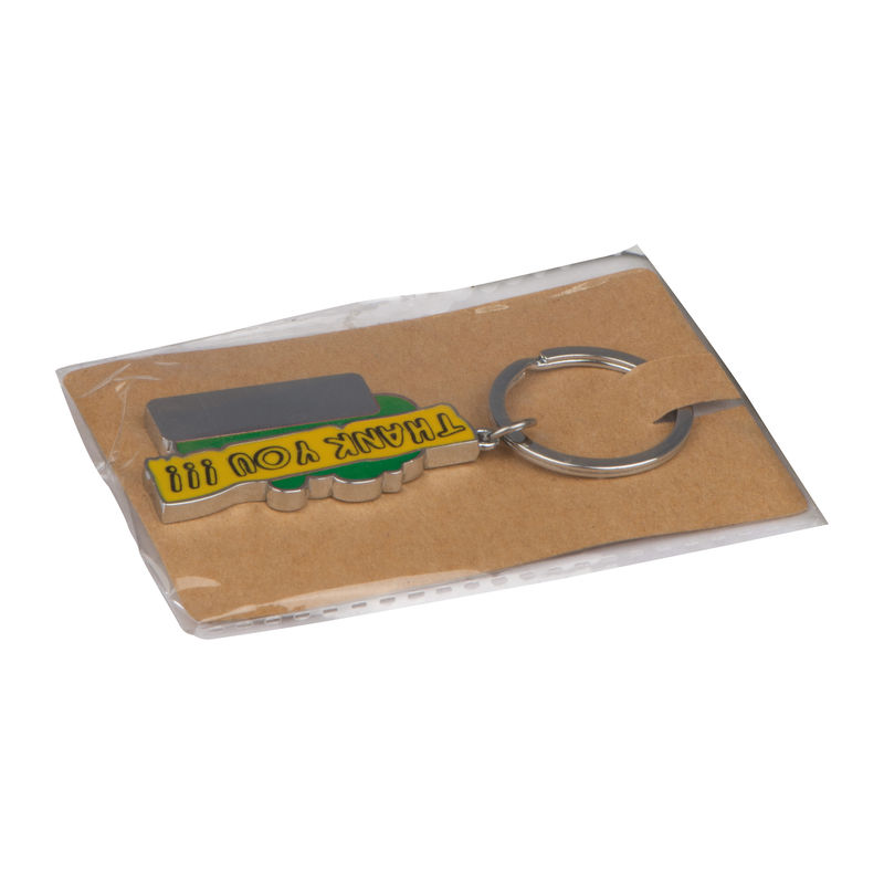 Breloc fabricat din metal cu partea frontală colorată şi lăcuită.