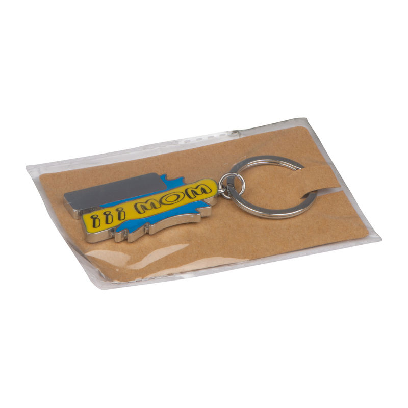 Breloc fabricat din metal cu partea frontală colorată şi lăcuită.