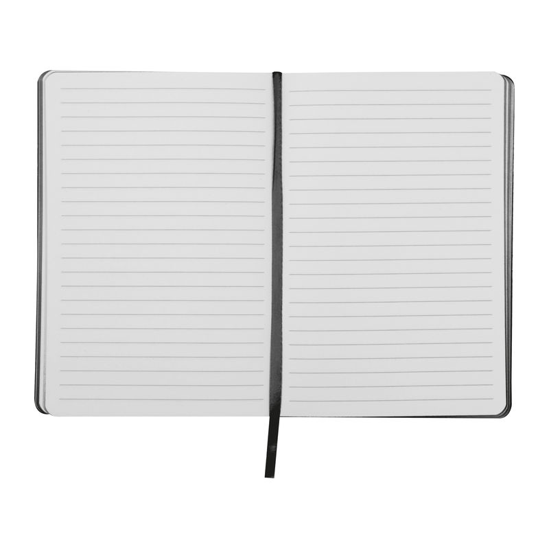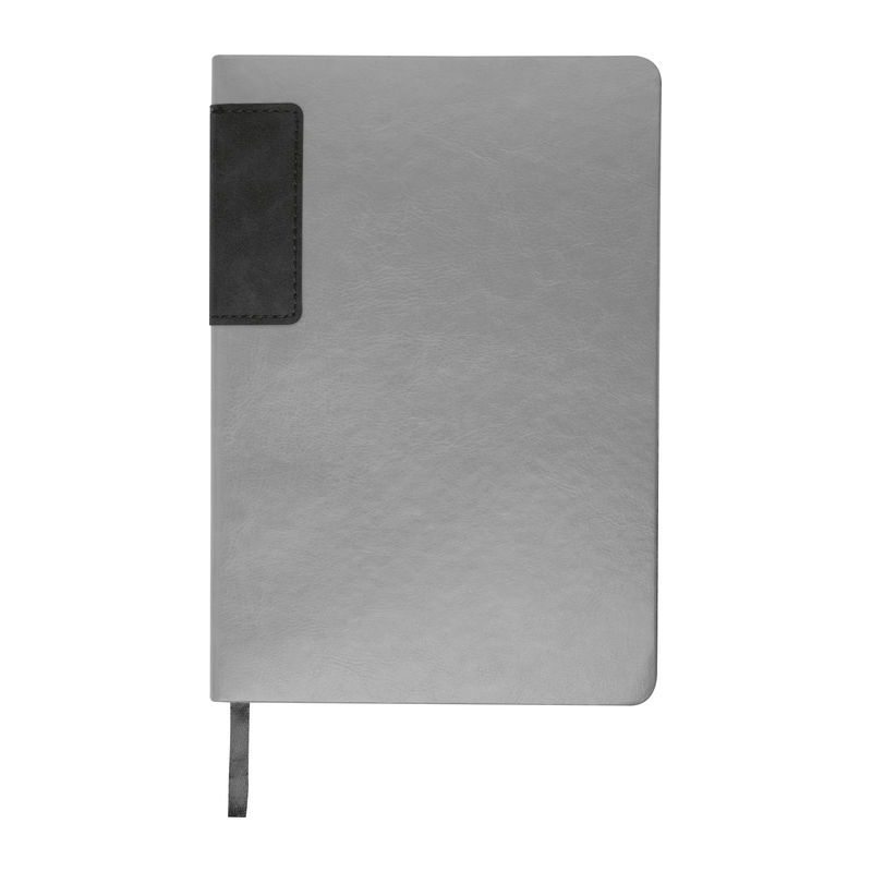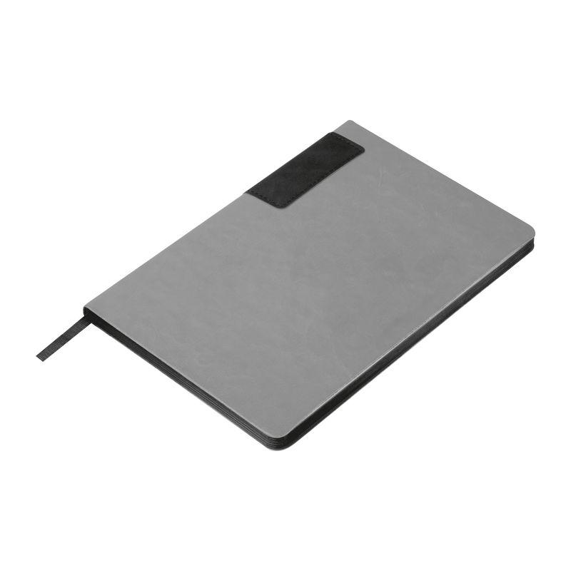 Caiet A5 gri din PU reciclat, 160 pagini liniate (80 coli) din hârtie reciclată, cu margini colorate.