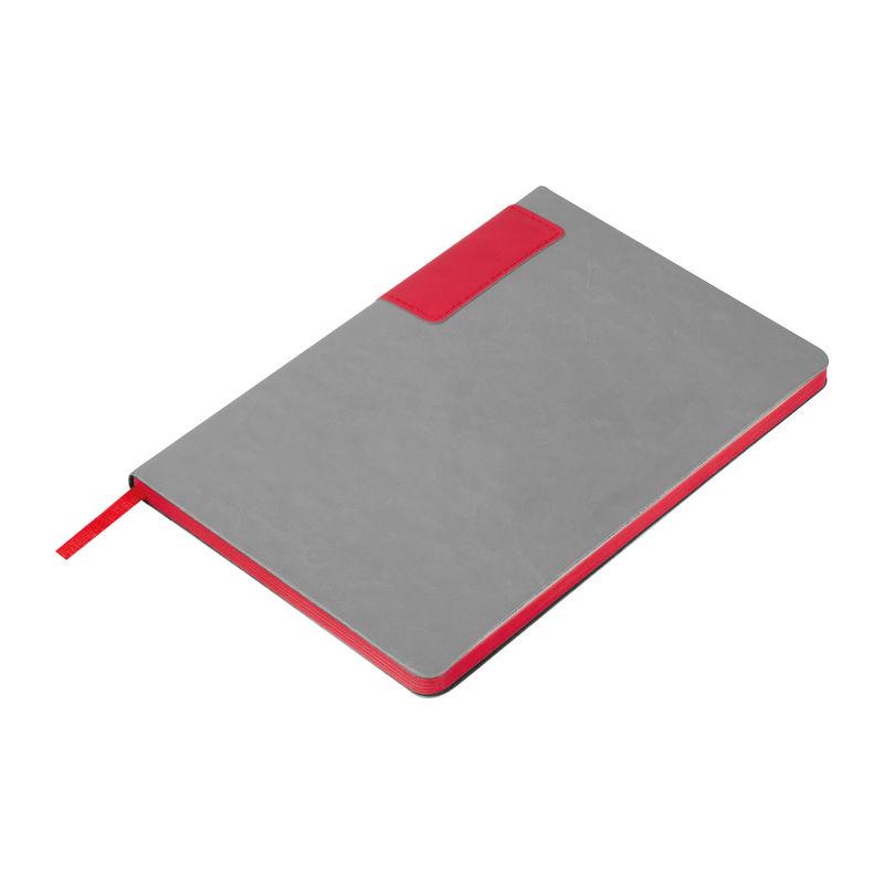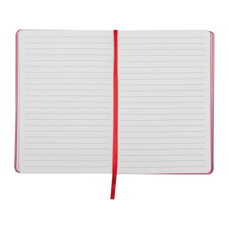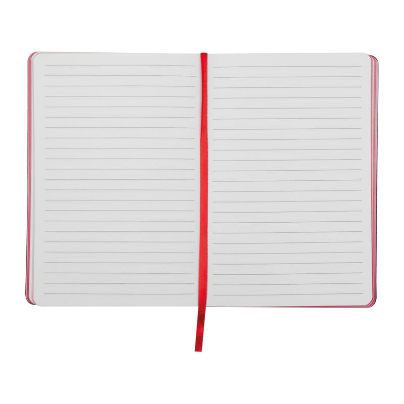 Caiet A5 gri din PU reciclat, 160 pagini liniate (80 coli) din hârtie reciclată, cu margini colorate.