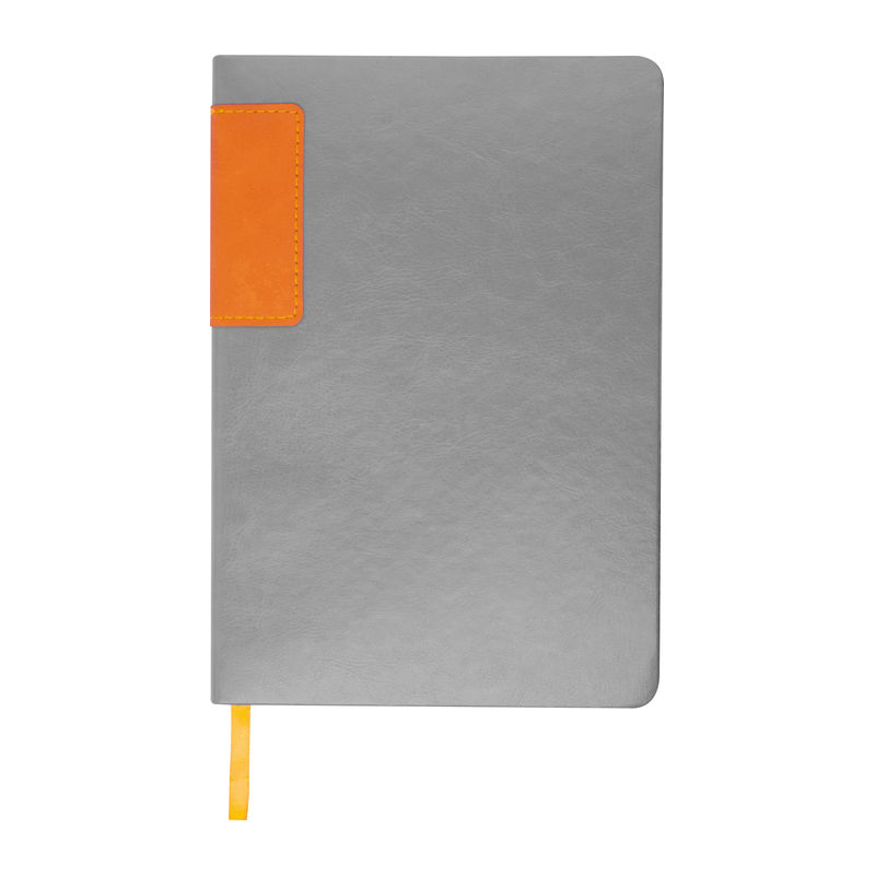 Caiet A5 gri din PU reciclat, 160 pagini liniate (80 coli) din hârtie reciclată, cu margini colorate.