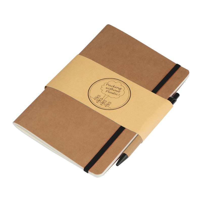 Caiet notes A5, cu 120 pagini din hârtie reciclată, cu bandă elastică pentru închidere, buclă pentru pix, include și pixul cu mină cu cerneală albastră.