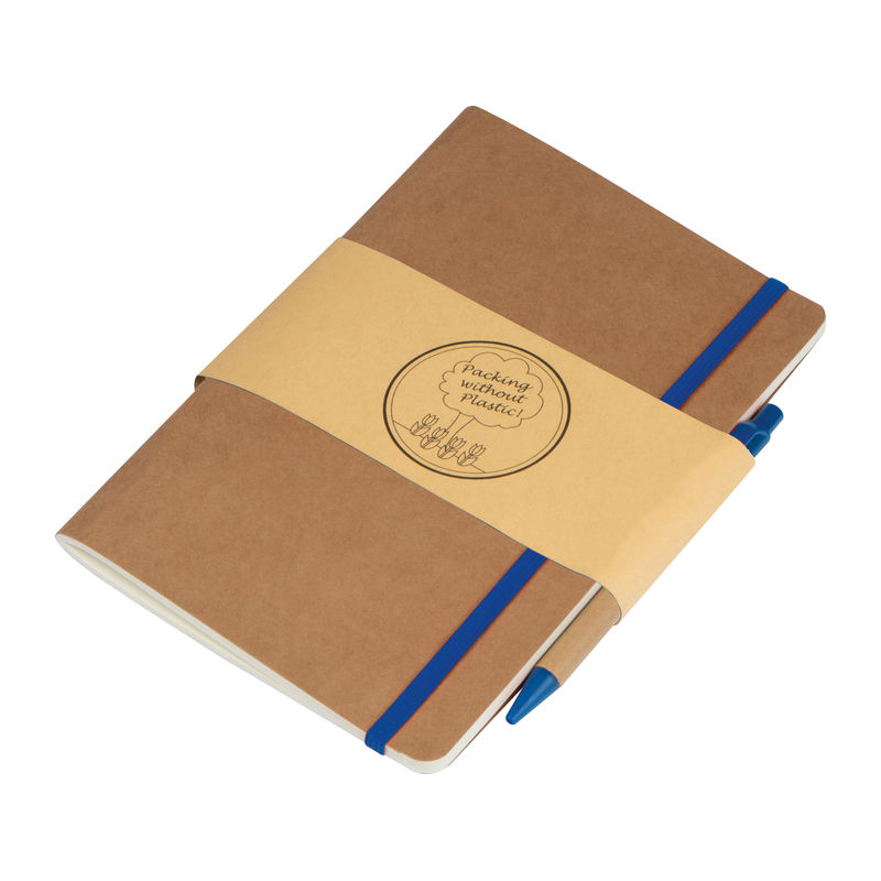 Caiet notes A5, cu 120 pagini din hârtie reciclată, cu bandă elastică pentru închidere, buclă pentru pix, include și pixul cu mină cu cerneală albastră.