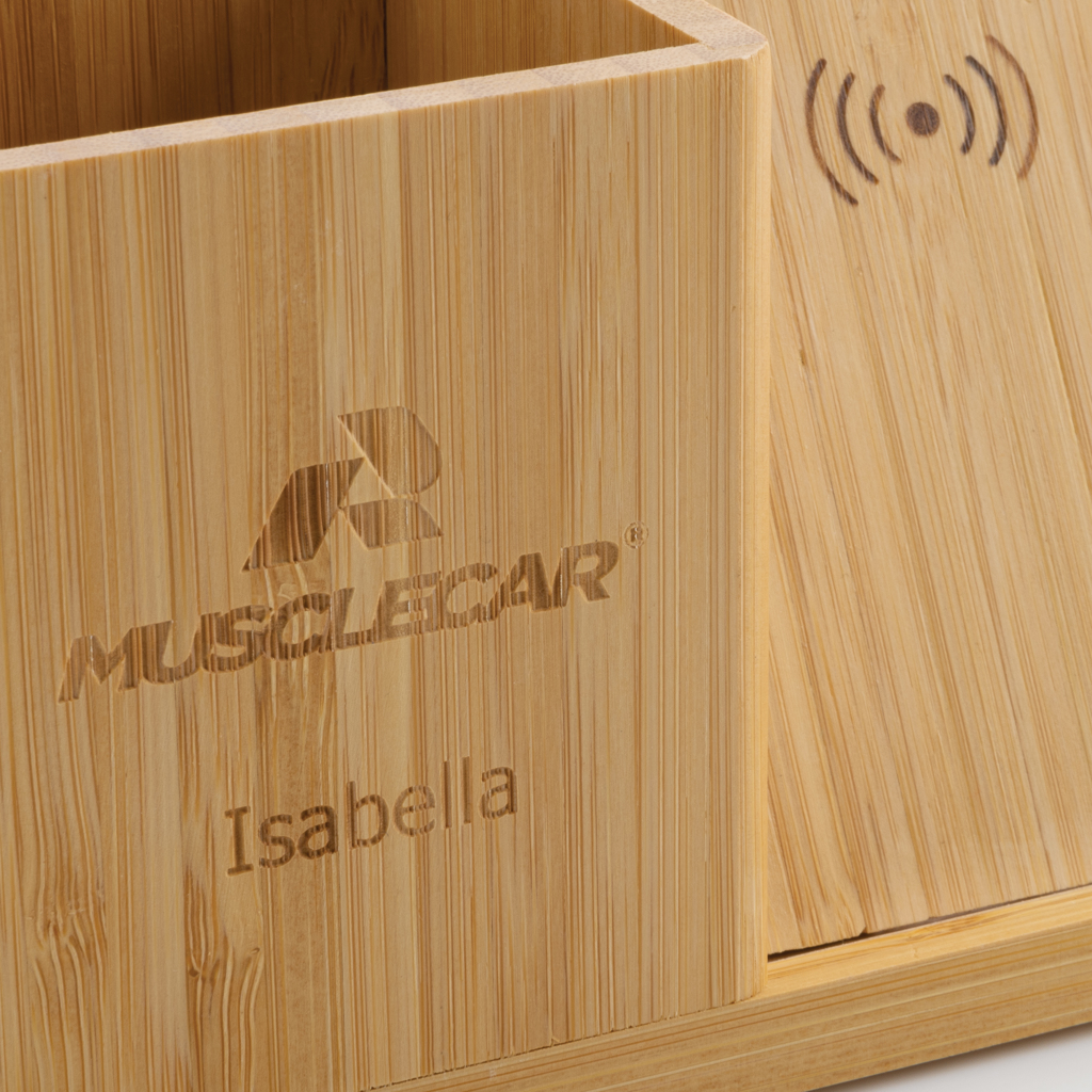 10W wireless fast charger with pen holder made with RCS (Recycled Claim Standard) certified recycled ABS. Total recycled content: 6% based on total item weight (including bamboo base) The bamboo exterior of the organiser is fully made from FSC 100 bamboo. Including 120 cm type C charging cable made from RCS certified recycled TPE. Packed in FSC mix kraft box. Type-C Input 5V/2A; 9V/1.67A. Wireless output 5V/1A;9V/1.1A (10W) Registered design®