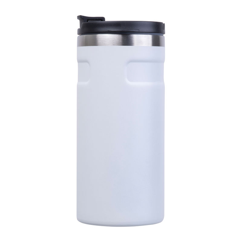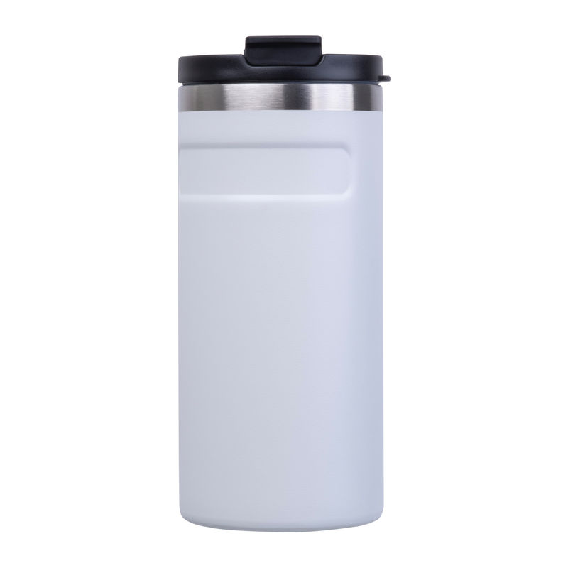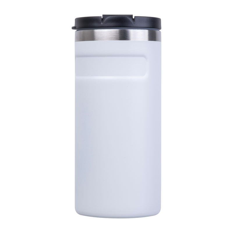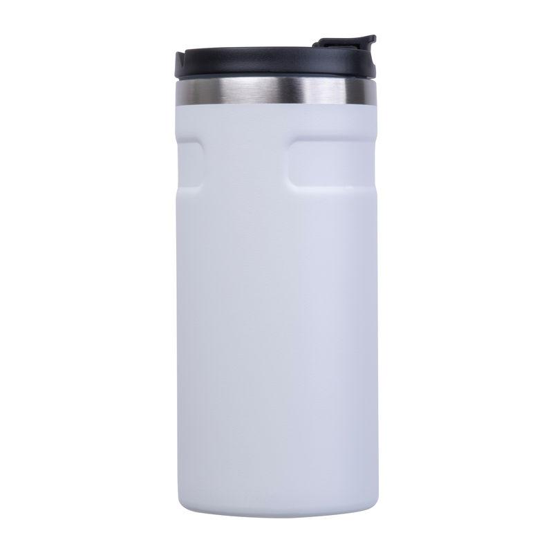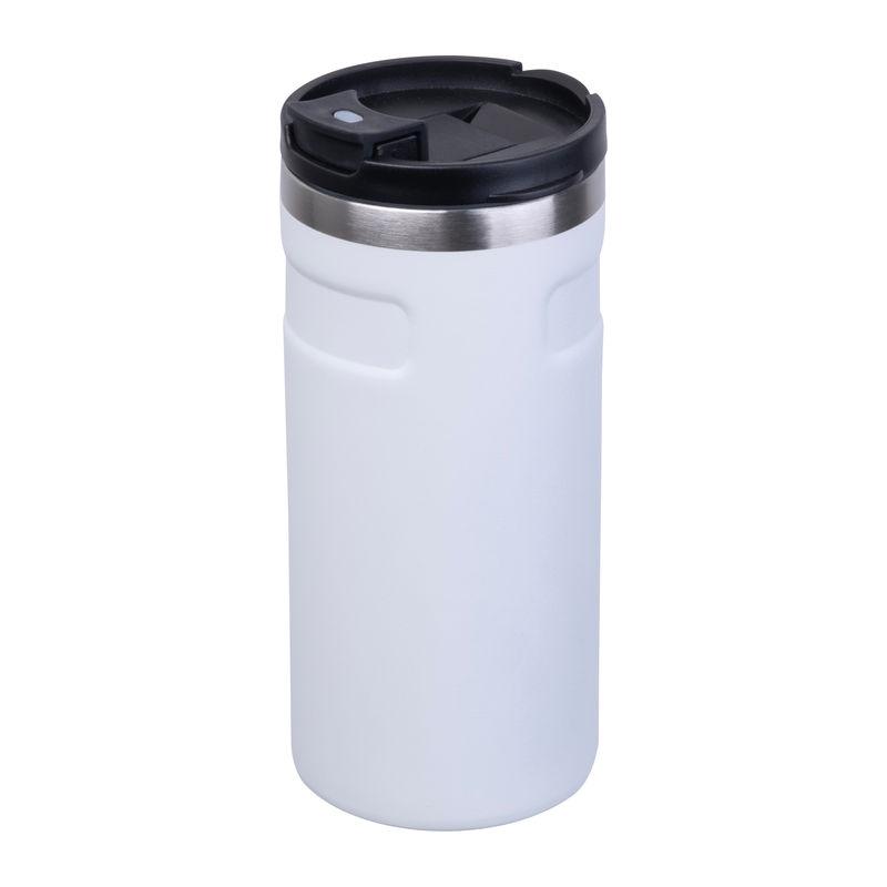 Pahar termoizolant cu perete dublu, din oțel inoxidabil reciclat, cu un orificiu de băut etanș și capacitate de 450 ml.