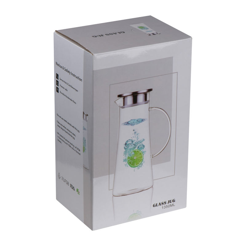 Carafă din sticlă cu capac din oţel inoxidabil şi capacitate de 1350 ml. Capacul are 2 tipuri de deschidere: o deschidere pentru filtru și o deschidere mare.