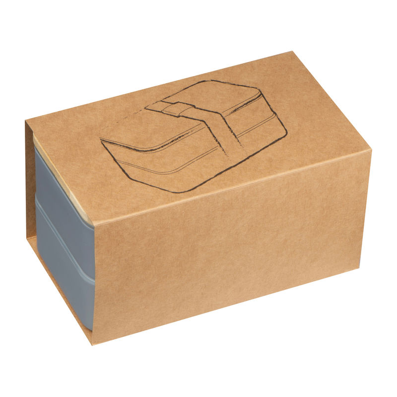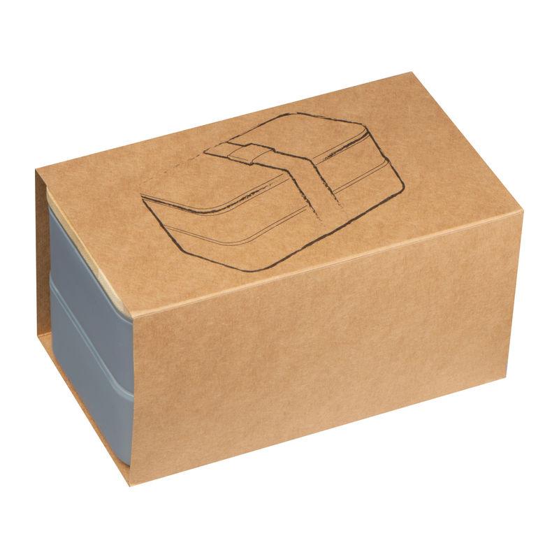 Cutie de prânz cu două niveluri, cu două compartimente separate (fiecare cu propriul capac), capac din bambus, un separator, cuţit, furculiţă, lingură și elastic pentru închidere.
