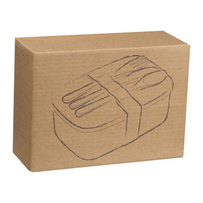 Cutie pentru prânz din oţel inoxidabil, cu capac din bambus, cuţit, furculiţă și lingură, precum și o bandă pentru închidere. Bambusul fiind un material natural, pot apărea diferenţe în textură și culoare, ceea ce poate influenţa imaginea personalizată.