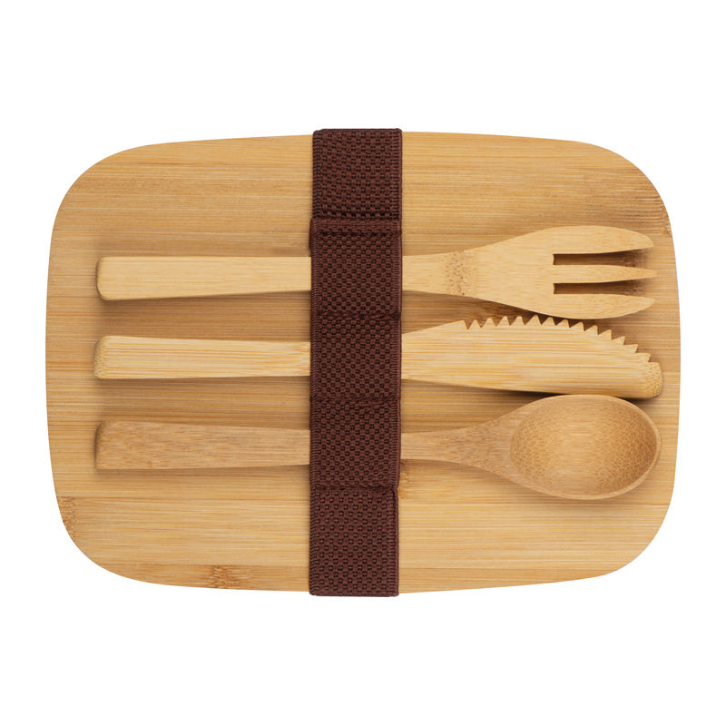 Cutie pentru prânz din oţel inoxidabil, cu capac din bambus, cuţit, furculiţă și lingură, precum și o bandă pentru închidere. Bambusul fiind un material natural, pot apărea diferenţe în textură și culoare, ceea ce poate influenţa imaginea personalizată.