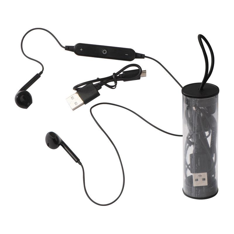 Căşti audio cu Bluetooth, cu control pentru volum şi cablu USB. Setul vine într-un suport transparent cu cârlig.
