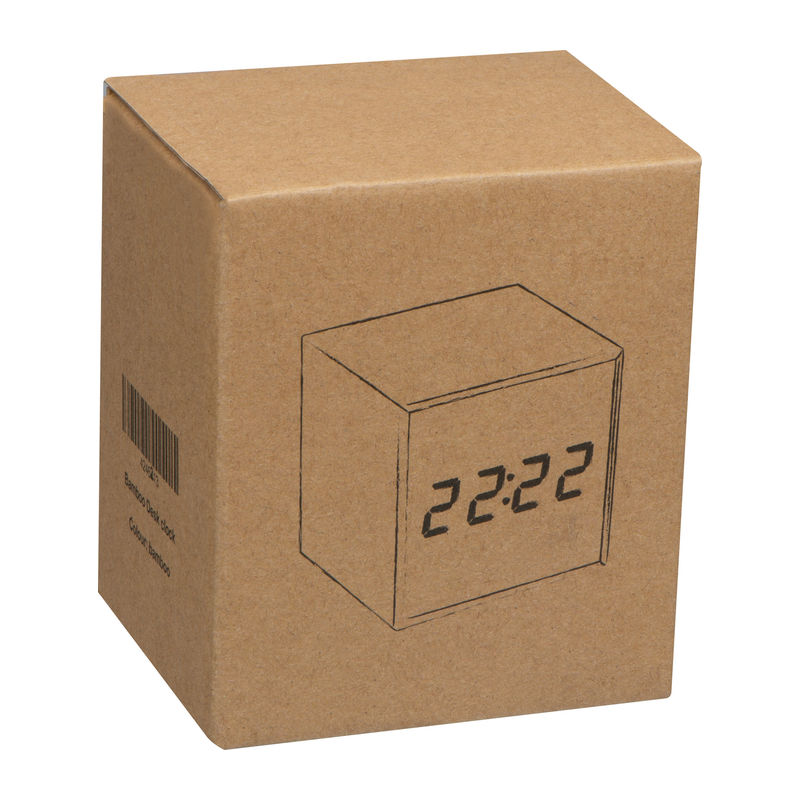 Ceas elegant de masă cu carcasă din lemn, afișaj negru și LED albastru care arată alternativ ora, data și temperatura.