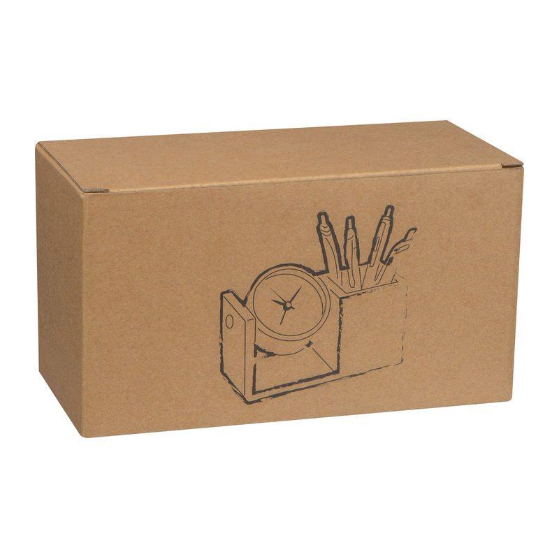 Ceas de birou din aluminiu, pe o bază din bambus de culoare naturală cu suport pentru instrumente de scris.