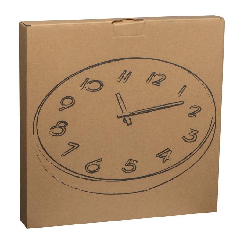Ceas de perete, silenţios, fabricat din lemn, cu numere și arătătoare tot din lemn.