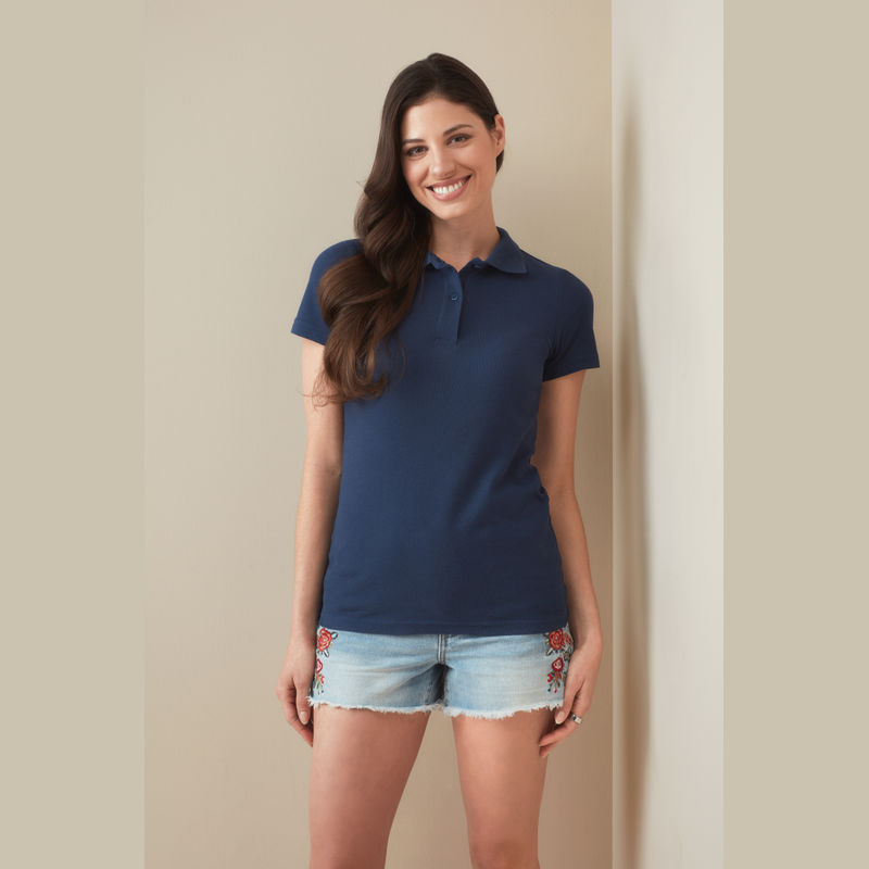 Soft single jersey polo shirt for women, with a pleasing piqué look, rib collar and 2 tone-on-tone buttons.