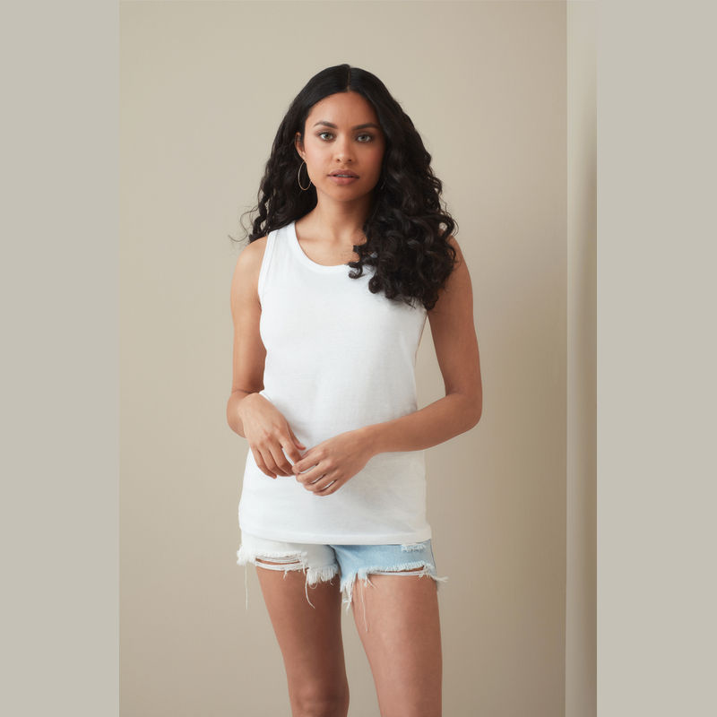 Soft tank top for women, with side seams, collar and arm holes with binding and made of durable single jersey cotton.