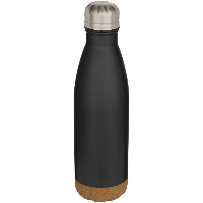 Vacuum insulated stainless steel water bottle with cork details at the bottom. The double-wall insulation keeps drinks hot or cold for several hours. Presented in a recycled cardboard gift box. Volume capacity: 500 ml.