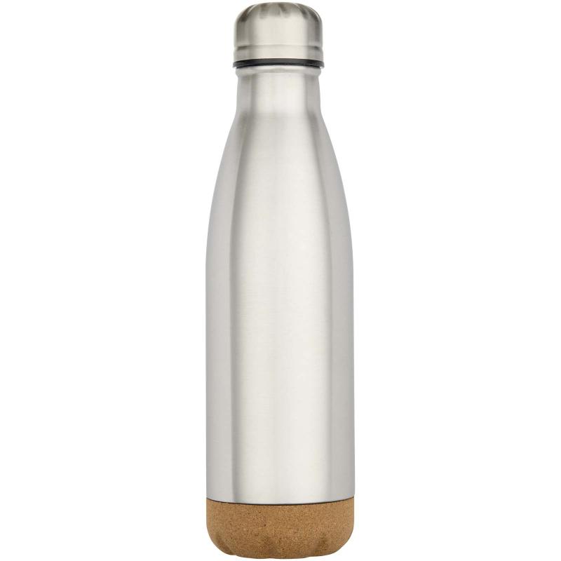 Vacuum insulated stainless steel water bottle with cork details at the bottom. The double-wall insulation keeps drinks hot for 12 hours and cold for 48 hours. Presented in a recycled cardboard gift box. Volume capacity: 500 ml.