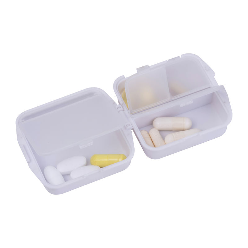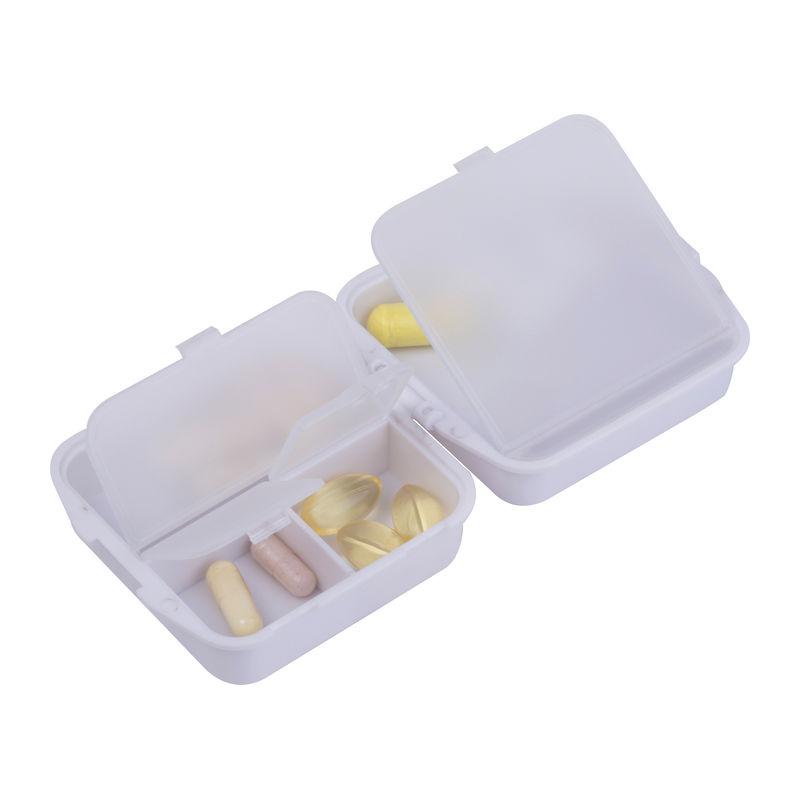 Cutie practică din plastic pentru pastile, cu patru compartimente individual închise.