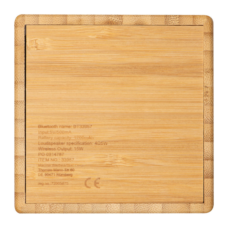 Boxă Bluetooth din bambus (versiunea 5.3) cu încărcător wireless de până la 15 watt, afișaj digital al orei, funcţie de alarmă și afișaj al temperaturii. Bateria reîncărcabilă cu capacitate de 1200 mAh / 3,7 volt.