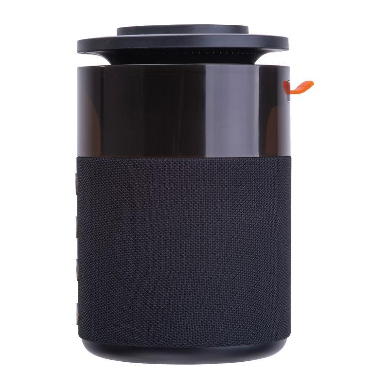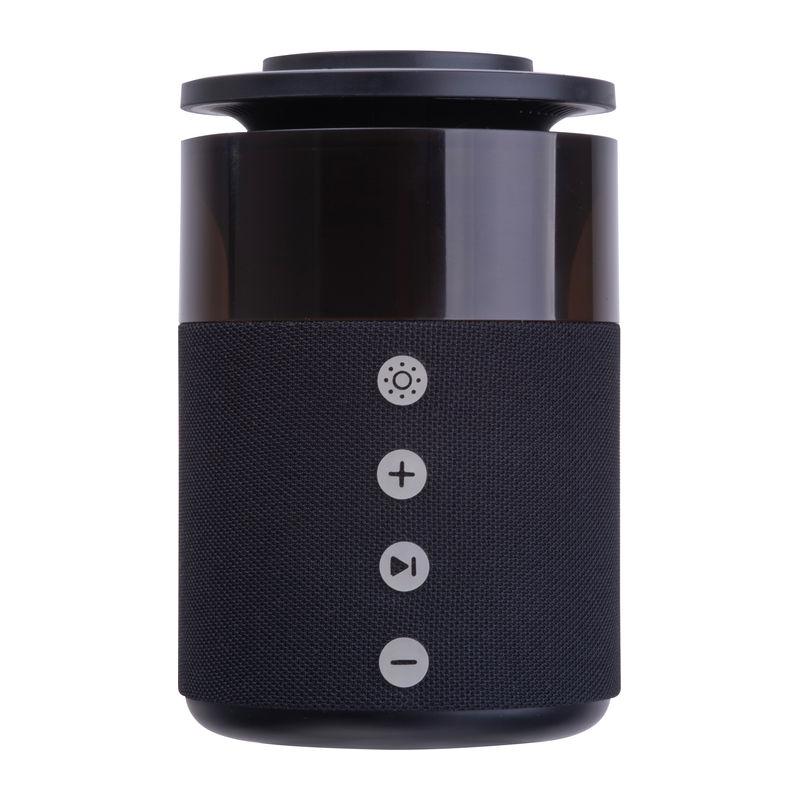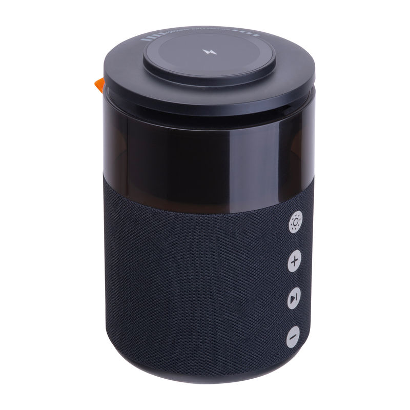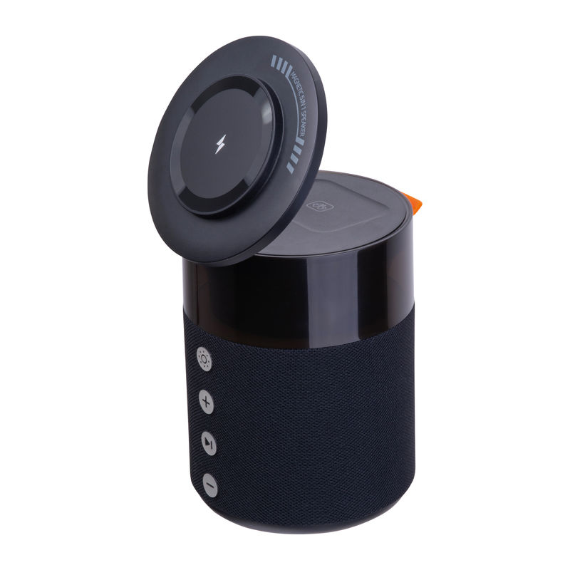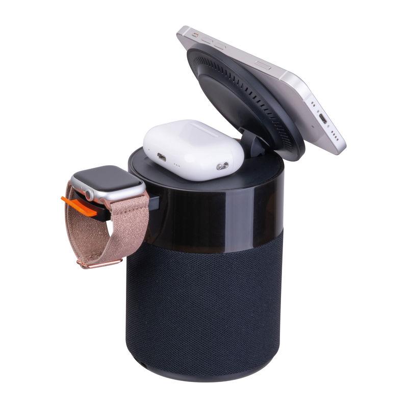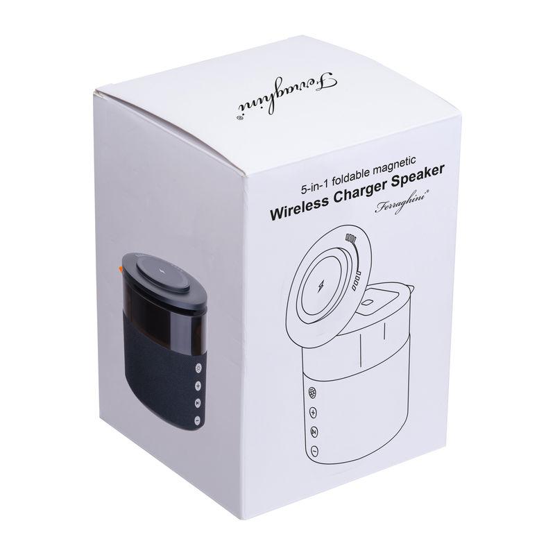 Boxă Bluetooth 5-in-1 5W Ferraghini cu încărcător wireless integrat pentru smartphone-uri, căști Apple AirPods și ceasuri inteligente Apple, livrat cu cablu USB-C. Baterie 1800 mAh, autonomie 4–6 ore. Dotat cu lumină de veghe LED.
