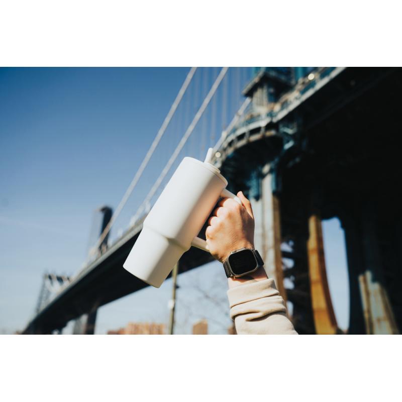 Experience the spacious yet conveniently portable embrace of our generously sized tumbler – not too big, not too small. Its comfort-grip handle and slim base make it a perfect fit for most cup holders, ensuring you stay refreshed whether you're enduring a long day of meetings, conquering a rowing class, or embarking on a trip out of town. Crafted from durable recycled stainless steel, this 900 ml. tumbler rises to the hydration challenge. This double-walled, vacuum-insulated tumbler comes complete with a spill secure lid, recycled steel straw, and a silicone straw tip. The screw-on lid boasts a dual function, offering a convenient drinking spout or the option to use a straw. We recommend handwash. RCS certification ensures a completely certified supply chain of the recycled materials. Total recycled content: 70% based on total item weight. BPA free.