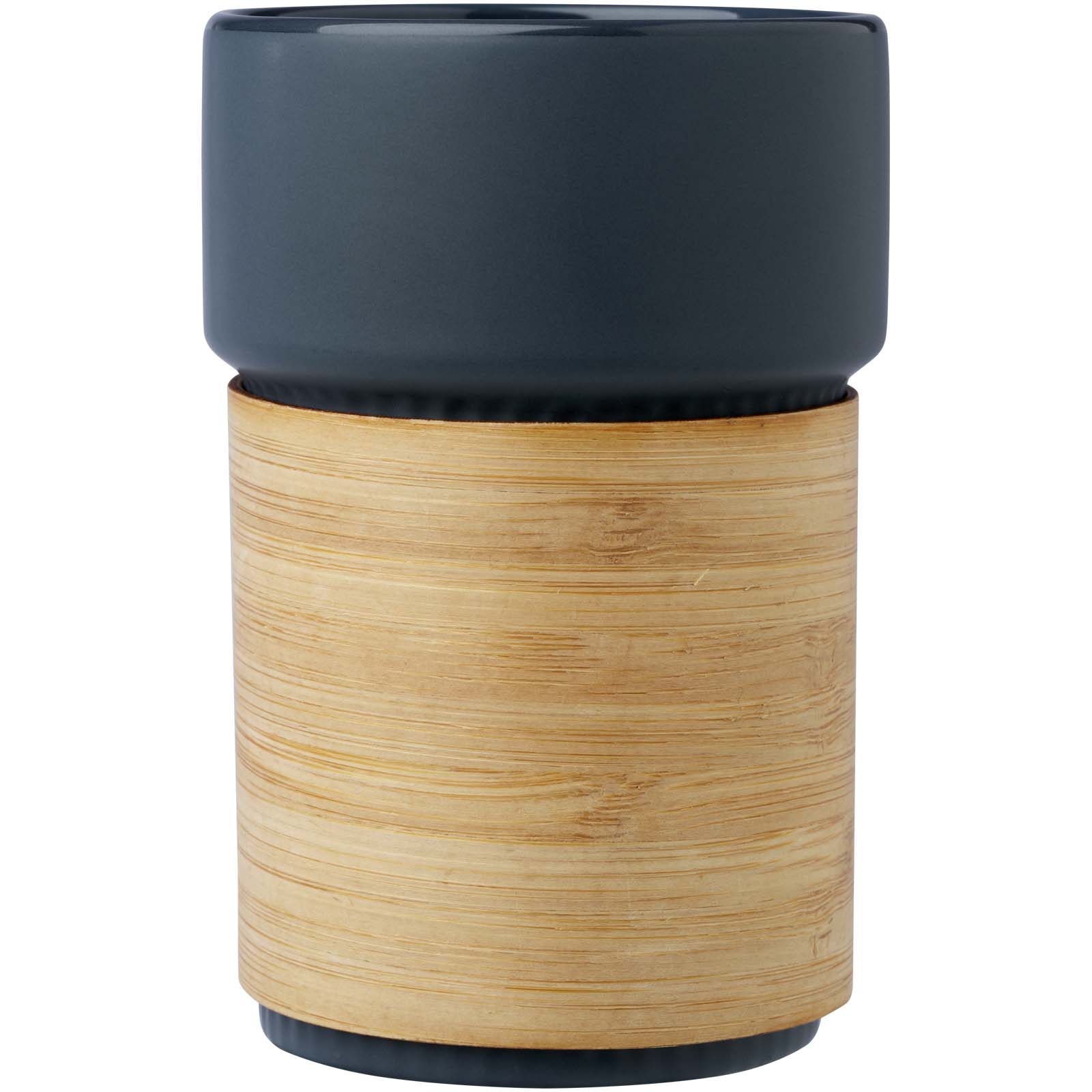 The stylish Fika ceramic tumbler comes with a removable bamboo sleeve that is ideal to use when drinking hot beverages. The bamboo used comes from sustainable, environmentally friendly and socially responsible sources. Volume capacity: 340 ml. Delivered in a recycled cardboard box.
