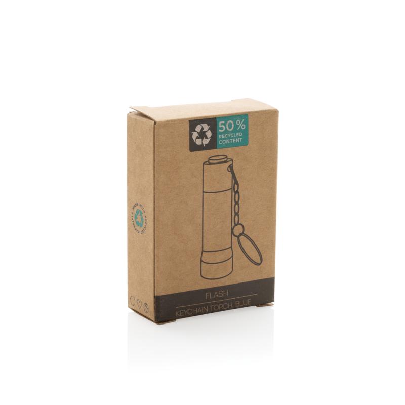 3 LED pocket size torch made with RCS recycled aluminum Total recycled content: 50% based on total item weight. RCS certification ensures a completely certified supply chain of the recycled materials. With 15 lumen that allow an operating time up to 6 hours on one set of batteries (included) With keychain. Beam distance: 3 metre. Packed in FSC® mix kraft packaging.