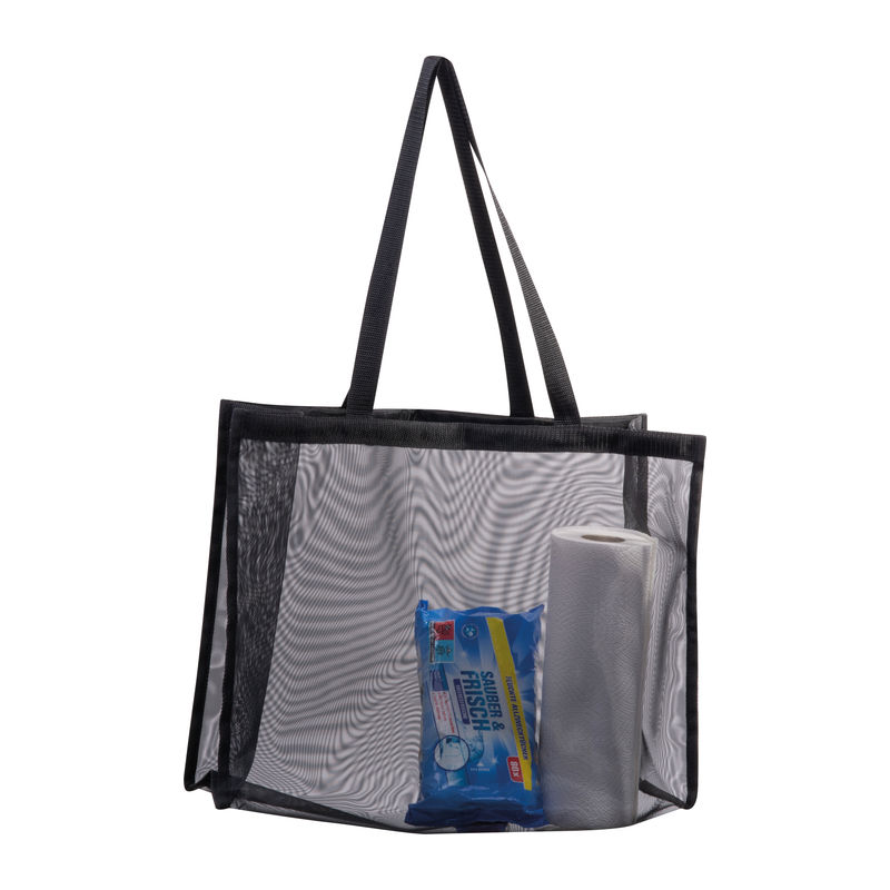 Sacoșă mare, transparentă, pentru plajă sau cumpărături, din poliester, cu mânere lungi.
