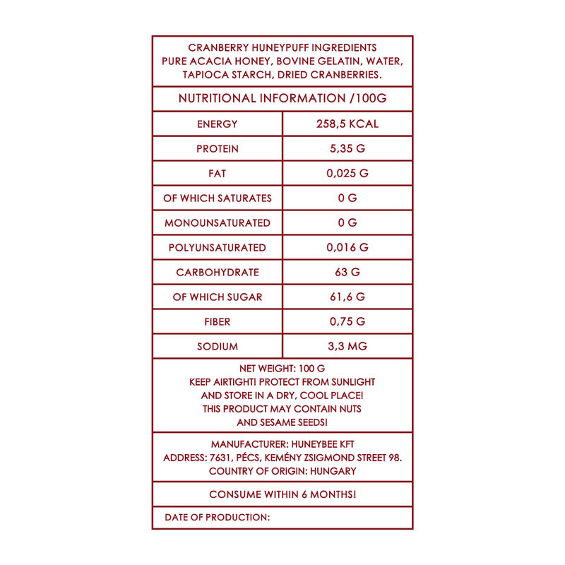 Discover the new dimension of honey consumption with these natural HoneyPuffs. Huneybee is a family-owned business reimagining traditional honey consumption. We address a fundamental market challenge that has long limited the use of honey: its stickiness and difficulty in portability. We've uniquely transformed honey into a light yet solid form, allowing you to take nature's golden treasure with you wherever you go. We are committed to providing a healthy alternative amongst highly processed sweets. Thanks to our gentle process, our product preserves the valuable enzymes and vitamins found in acacia honey, so its consumption not only provides enjoyment but also naturally supports your body. We don't use any artificial additives, added sugars, or preservatives during production. It's just honey, as nature intended it; we only gave it a new form. Curious how to consume it? HoneyPuffs are perfect on their own, but they can be a healthy snack for kids or an ideal choice for adults who crave a quick and delicious energy boost. You can liven up your breakfast with it, and it can even be a special flavoring for lukewarm drinks. Cranberry: Flavored with dried, ground cranberry pieces. The price listed includes a label with a unique label for orders over 50 pieces. For orders under 50 pieces, please request a unique price for the label.