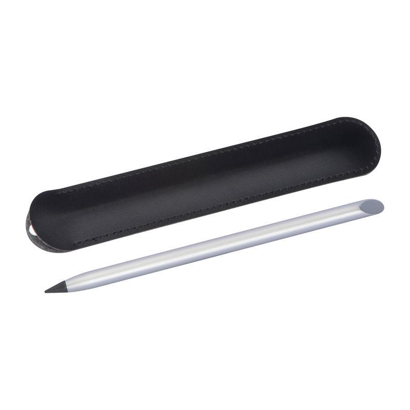 Creion metalic fără cerneală cu etui negru. Un plumb special aliat, oxidează scrisul de pe hârtie, astfel poate fi ștearsă cu o radiera.