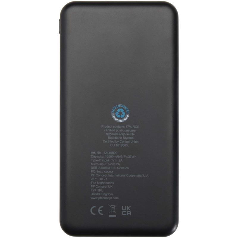 Stay charged with the Intan 10.000 mAh power bank, made from recycled plastic. It features two USB-A output ports, a Type-C input/output port, and a micro-USB input for flexible charging options. The sleek design includes an LED indicator to display charging status, making it a reliable power source throughout the day.