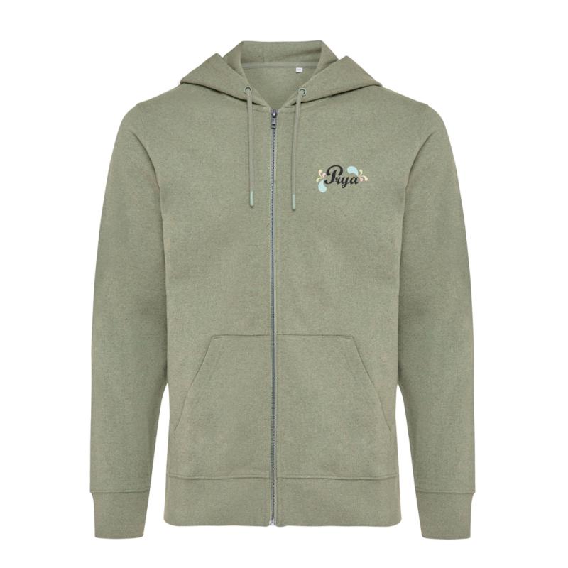 Unisex modern fit zip through hoodie made from 100% cotton, of which 50% is recycled and 50% organic, in 340 G/M². The zip through hoodie has a double-layered hood, long sleeves and 1x1 rib. The inside is soft-brushed fleece for extra comfort. The use of genuine recycled & organic fabric materials and environmental impact claims are guaranteed, by using the AWARE™ disruptive physical tracer and blockchain technology. By scanning the QR code, you will gain access to a dedicated digital passport of the product. 2% of proceeds of each sold product will be donated to Water.org. This product is OEKO-TEX® STANDARD 100 Centexbel certified. Due to the nature of recycled yarns, impurities and colour variations may appear