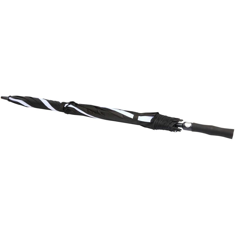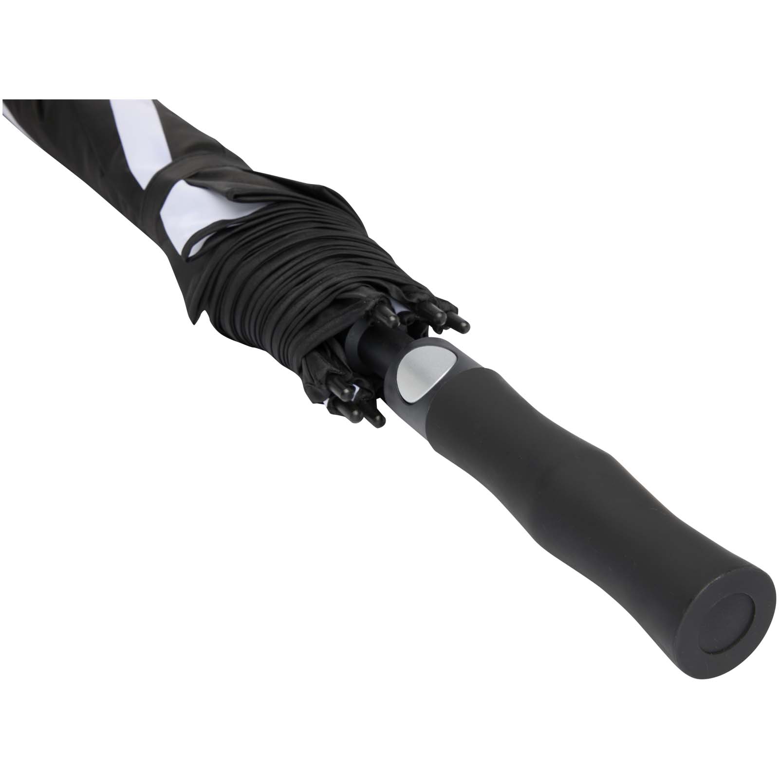 The Jeff windproof golf umbrella is designed with a spacious polyester canopy, comfortably shielding multiple people from the elements. The robust fibreglass shaft and frame provide excellent flexibility, offering strong resistance against high winds. A practical plastic handle with an auto-open button ensures quick and easy operation. The contrasting canopy panels present a perfect opportunity for bold, eye-catching branding—ideal for events, promotions, or everyday use.