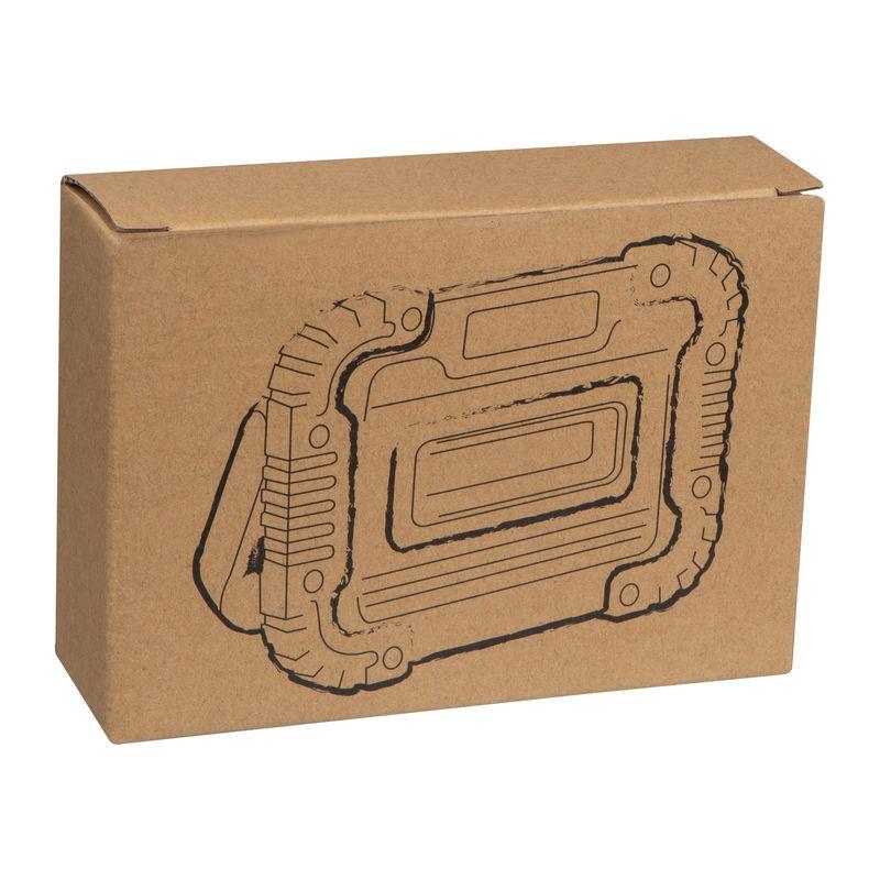 Lampă de lucru din plastic cu o putere de 10W, 3 funcţii de iluminat (continuu, SOS și intermitent), și un mâner pliabil pentru așezare sau transport.