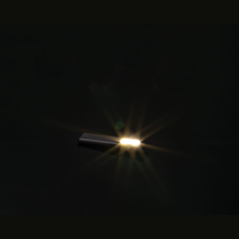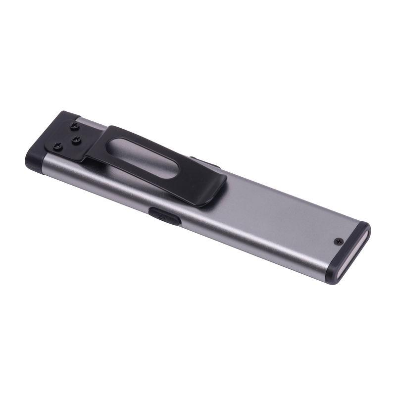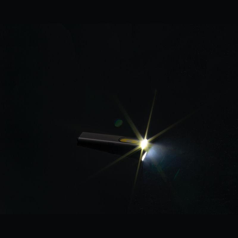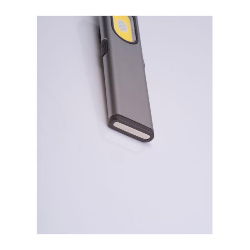 Lanternă COB reîncărcabilă (450 mAh) din aluminiu reciclat, cu lumină laterală (160 lumeni) și frontală (80 lumeni), clemă și capăt magnetic. Include cablu de încărcare.