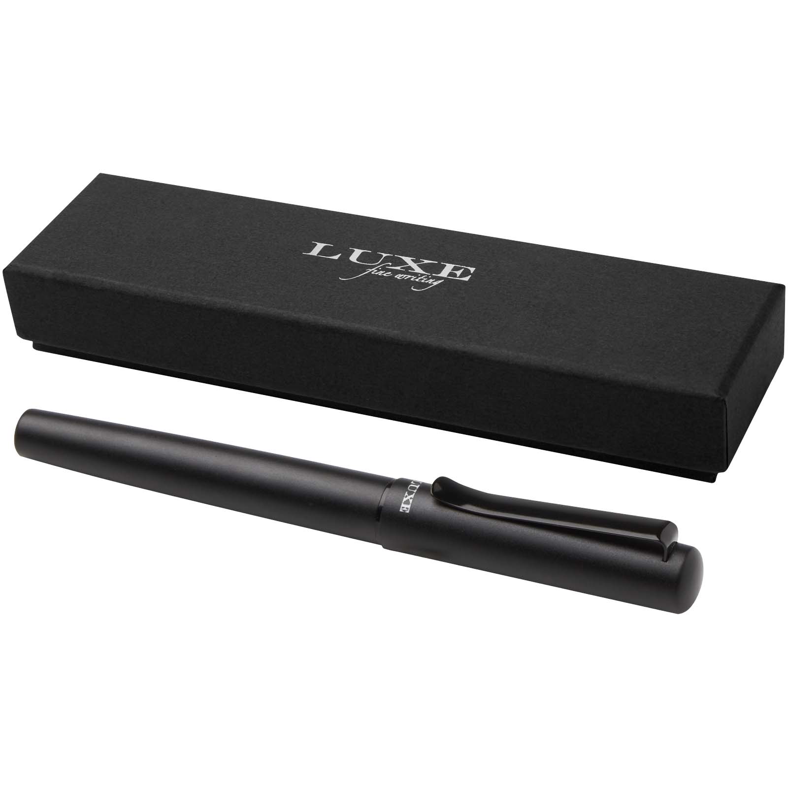 Fountain pen with a recycled aluminium barrel with matte black coating and a black recycled aluminium grip. Aluminium is a recyclable material and by choosing this pen, you can support more sustainable practices and give new life to discarded aluminium materials. This stylish fountain pen serves as a practical and more sustainable option for individuals and organisations looking for environmentally friendly writing instruments. Delivered with a black cartridge and a black gift box. Box size: 16.8 x 4.2 x 2.5 cm.